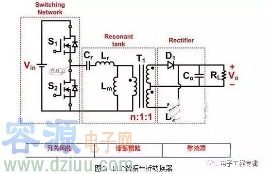 串聯諧振特性允許直流(DC)/DC LLC-SRC中的開關網絡(如圖2所示)擁有很寬范圍的零電壓開關(ZVS);因此,LLC-SRC能在前端電源應用中輕松實現超過94%的效率,并能在高開關頻率下運行。