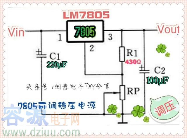 7805的典型應用電路是輸出5V的固定電壓。實際中,我們有時候可能會用到一些非標稱值的電壓。譬如需要一個7.8V的穩定電壓,這時在7805外圍接兩個電阻即可將輸出的5V電壓抬高到7.8V。上圖中的輸出電壓Vout由電阻R1和RP決定。改變RP的阻值,即可獲得所需的輸出電壓。這里需要注意的是,要求Vin>2V+Vout。2V為7805正常工作時所需的最低壓差。