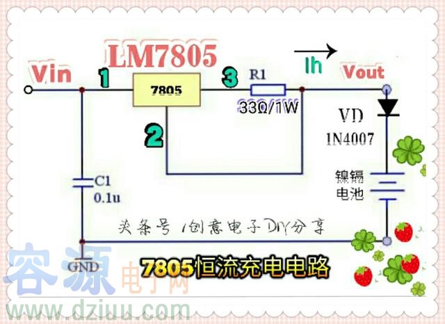 上圖中,7805、R1及VD構成一個恒流充電電路。恒定電流(充電電流)Ih=5V/R1=5V/33Ω≈0.15A。改變R1的阻值,即可調整充電電流。圖中的1N4007為防倒流二極管。