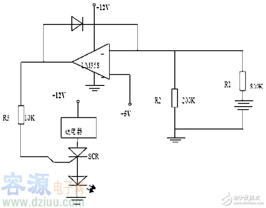 整個電路的原理如圖所示LM358、繼電器均用12V供電,LM358的反向輸人端接5V的參考電壓,采樣電路采用0一30V可調直流供電,整個電路按原理連接好后,當采樣電壓小于5V時,LM358輸出低電平,此時可控硅控制端的沒有正電壓,所以可控硅不導通,繼電器不工作,發光二極管不亮當采樣電壓大于5V時,LM358輸出高電平,此時,硅的控制腳得到一個正向電壓,此時,繼電器工作,發光二極管發光。說明可控硅已導通。此時再將采樣電壓降到5V以下,可控硅仍保持導通狀態,說明這個電路已經通過一個二極管被鎖住。容-源-電-子-網-為你提供技術支持