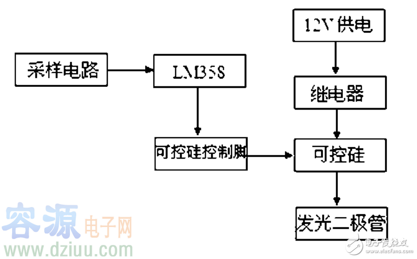 如圖所示,采樣電路設計與前面設計的控制電路的采樣相同,采樣電壓送人比較器lm358的同相輸人端,比較器的輸出端接可控硅的控制腳,通過LM358的輸出狀態來控制可控硅的導通狀態。可控硅的陽極通過一個繼電器接12V供電,陰極接一個發光二極管,通過觀察二極管的發光狀態來判斷可控硅的導通情況。