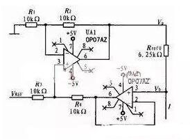 由于溫度對集成運放參數影響不如對晶體管或場效應管參數影響顯著,由集成運放構成的恒流源具有穩定性更好、恒流性能更高的優點。尤其在負載 一端需要接地的場合,獲得了廣泛應用。所以采用圖2所示的雙運放恒流源。其中放大器UA1構成加法器,UA2構成跟隨器,UA1、UA2均選用低噪聲、低失調、高開環增益雙極性運算放大器OP07。