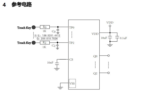 VK36Q4 工作電壓/待機電流:2.4V-5.5V/6A(3V) 感應通道數:4 輸出方式:直接輸出抗干擾/待機電流小,抗電源及手機干擾,可通過CAP調節靈敏度 封裝:DFN10(3*3超小體積)