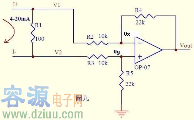 分析一個大家接觸得較多的電路。很多控制器接受來自各種檢測儀表的0~20mA或4~20mA電流,電路將此電流轉換成電壓后再送ADC轉換成數(shù)字信 號,圖九就是這樣一個典型電路。如圖4~20mA電流流過采樣100Ω電阻R1,在R1上會產(chǎn)生0.4~2V的電壓差。由虛斷知,運放輸入端沒有電流流 過,則流過R3和R5的電流相等,流過R2和R4的電流相等。故: