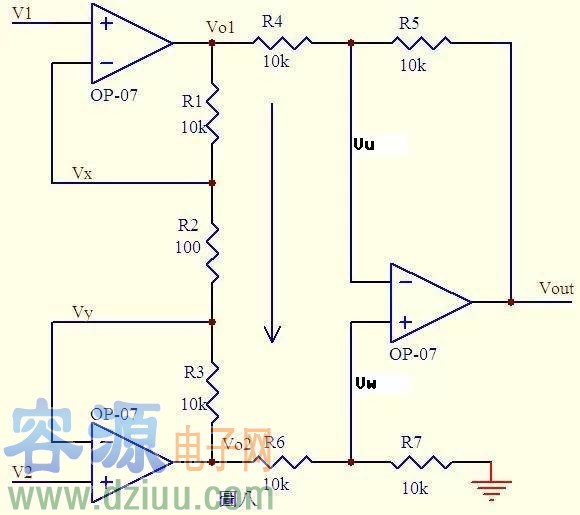 由dh得 Vout = (Vy –Vx)(R1+R2+R3)/R2 上式中(R1+R2+R3)/R2是定值,此值確定了差值(Vy –Vx)的放大倍數(shù)。