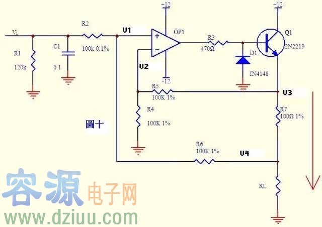 上式說明R7兩端的電壓和輸入電壓Vi相等,則通過R7的電流I=Vi/R7,如果負載RL<<100KΩ,則通過Rl和通過R7的電流基本相同。