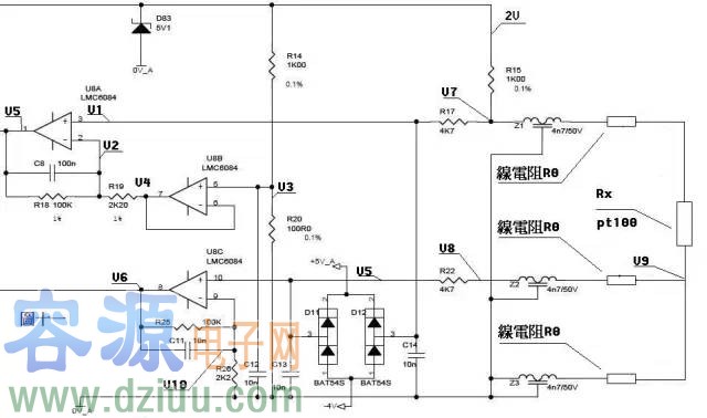 來一個復雜的,呵呵!圖十一是一個三線制PT100前置放大電路。PT100傳感器引出三根材質、線徑、長度完全相同的線,接法如圖所示。有2V的電壓加 在由R14、R20、R15、Z1、PT100及其線電阻組成的橋電路上。Z1、Z2、Z3、D11、D12、D83及各電容在電路中起濾波和保護作用, 靜態分析時可不予理會,Z1、Z2、Z3可視為短路,D11、D12、D83及各電容可視為開路。由電阻分壓知, V3=2*R20/(R14+20)=200/1100=2/11 ……a