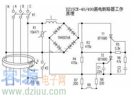 圖中L為電磁鐵線圈,漏電時可驅動閘刀開關K1斷開,每個橋臂用兩只1N4007串聯可提高耐壓。R3、R4阻值很大,所以K1合上時,流經L的電流很小,不足以造成K1斷開。R3、R4為可控硅T1、T2的均壓電阻,可以降低對可控硅的耐壓要求。K2為試驗按鈕,起模擬漏電的作用。按壓試驗按鈕K2,K2接通,相當于外線火線對地有漏電,這樣,穿過磁環的三相電源線和零線的電流的矢量和不為零,磁環上的檢測線圈的a、b兩端就有感應電壓輸出,此電壓立即觸發T2導通。由于C2預先有一定電壓,T2導通后,C2便經R6、R5、T2放電,使R5上產生電壓觸發T1導通。T1、T2導通后,流經L的電流增大,使電磁鐵動作,驅動開關K1斷開,試驗按鈕的作用是隨時可檢查本裝置功能是否完好。用電設備漏電引起電磁鐵動作的原理與此相同。R1為壓敏電阻,起過壓保護作用。
