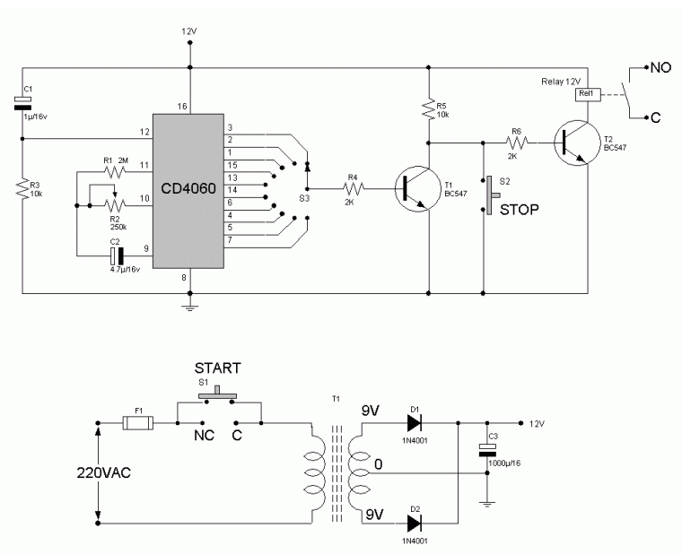 這是CMOS CD4060的電子計時器,它是CMOS 14級紋波傳送二進制計數(shù)器/分頻器和振蕩器。