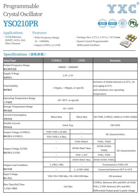 YXC晶振YSO210PR系列,頻率為125MHz,總頻差±50PPM,以下為YSO210PR系列規(guī)格書。