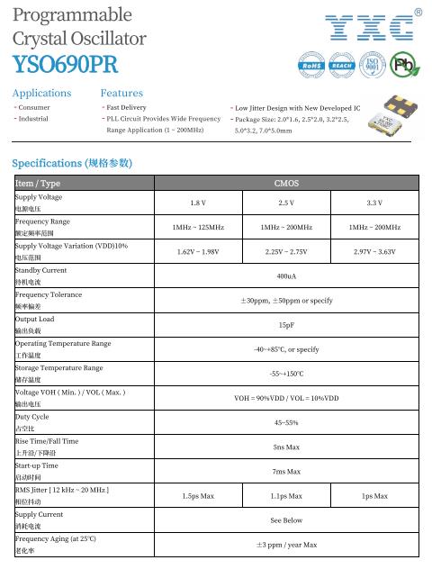 YXC晶振YSO690PR系列,頻率為100MHz,總頻差±50PPM,以下為YSO690PR系列規格書。