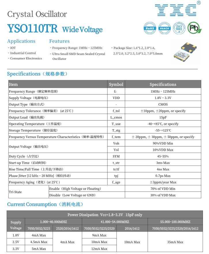 YXC晶振YSO110TR系列,頻率為16MHz,總頻差±30PPM,以下為YSO110TR系列規格書。