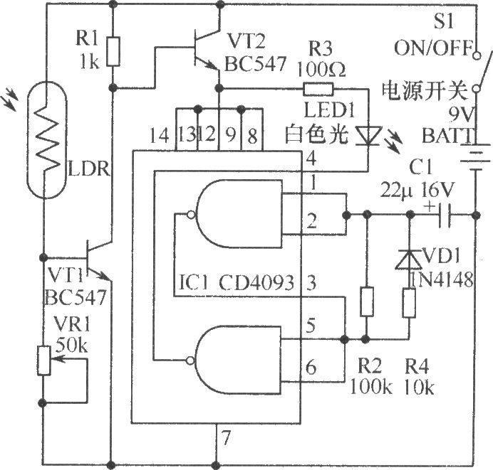 減少能量消耗。發(fā)光二極管采用閃光照明。IC1選擇CMOS集成電路CD4093。VT1、VT2選擇BC547三極管。LED1選擇Φ8mm白色發(fā)光二極管,其他元器件如圖