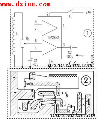 電路由音頻感應線圈L、功放和耳塞三部分組成。功放集成塊選用TDA2822,該集成電路靈敏度高、功耗低,電壓范圍寬(1.8~15V),外圍元件少、無噪聲(
