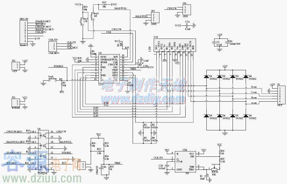 通過光藕隔離之后將CLK CW HF EN四個基本控制端引出單片機等可以非常方便的控制電路的工作這個板子改進的地方比較多也方便研究使用。板子使用1N5822快速二極管作為續(xù)流器件 其速度要遠遠快于整流橋的 L298和電機能夠提供更完善的有效的保護。模塊供電+5V(L297和L298控制供電) +12V(根據(jù)電機最低4V最高16V)給電機供電。