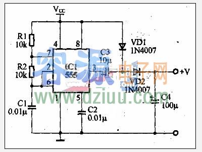 555集成電路和R1,R2、C1組成無穩態多諧振蕩器,按圖中阻、容參數,振蕩頻率約在5kHz左右,經VD1、VD2整流、倍壓輸出。假如輸入電壓VCC=12V,則輸出電壓約在20V~24V,根據負載大小而有所變化。 <<版權聲明:本文由容源電子網(www_dziuu_com)整理提供,部分內容來源于網絡,如有侵犯到你的權利請與我們聯系更正!