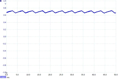 在本例的積分電路中,RC=10ms,只有兩倍的信號周期,但是通過測試,信號效果還是比較理想的。如果將更多的積分電路串聯,效果會更好。