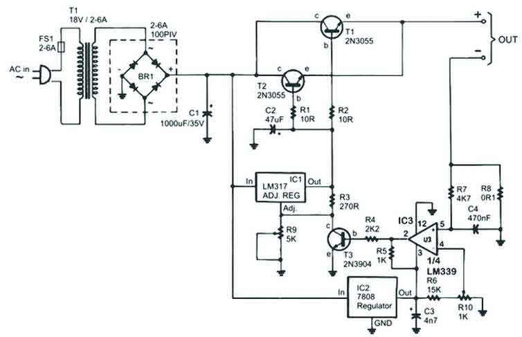 功率晶體管T1和T2的串聯(lián)連接,用于管理電池充電器的輸出電壓和充電電流速率。LM317可調(diào)電壓調(diào)節(jié)器將驅(qū)動(dòng)信號提供給功率晶體管T1和T2的基極。R9電位器設(shè)定輸出電壓電平。然后,R8用作電流采樣電阻,它連接在負(fù)輸出引線和電路接地之間。對于流經(jīng)R8的每個(gè)充電電流Amp,在其上產(chǎn)生100mV輸出。R8兩端產(chǎn)生的電壓饋入比較器IC3的一個(gè)輸入端。比較器的另一個(gè)輸入端是連接可變電阻(R10)。