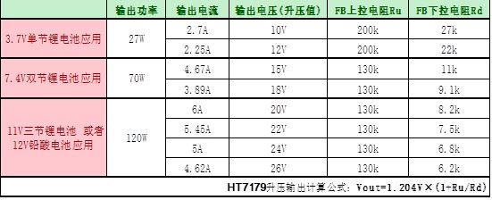 4.單節(jié)/雙節(jié)/三節(jié)鋰電或者鉛酸電池應(yīng)用升壓輸出電壓/功率以及對應(yīng)FB管腳設(shè)置電阻值: