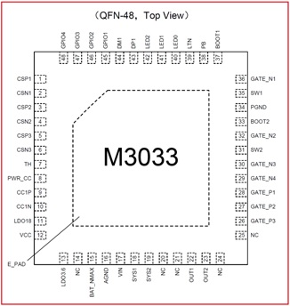 M3033 是一款電源管理 SOC,集成了單指令周期的高性能微處理器(MCU)、16-bit 高精度模/數(shù)轉換單元(SD-ADC)、Buck-Boost 控制單元、MOSFET 驅動接口、LED 直接驅動接口,以及多種安全保護機制。M3033支持 PD2.0、QC2.0 快充協(xié)議,配合少許外圍電路,即可組成 2-7 串電池的充電管理解決方案。采用QFN-48封裝。