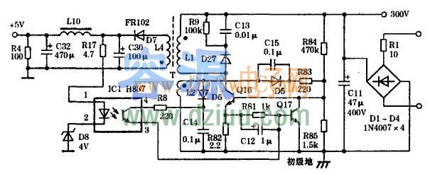 脈寬調(diào)制開關電源。Q16為開關管,R84為起動電阻,R83、C15為正反饋RC元件。D5為C15的放電通路。Q17為脈沖控制管,其基極R82的電壓降組成開關管Q16的過流保護電路,R81、C12