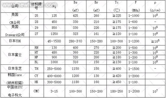 三、Nizncu鐵氧體的性能分析 我們常用的軟磁鐵氧體主要是MnZn、NiZn兩大系列。其中MnZn系產量大、用途廣,適用于低頻1MHz以下,它具有高μi、低損耗和高穩定性的優點。 例如μi可達4×104,μQ積一般為50~100萬(100KHz),最高可達20~300萬。Bs可在0.5T以上,Hc可在1OA/m以下,ρ為lOΩ/m ,αμ/μi與 D/μi為10-5~10-6。NiZn系材料在1MHz以下的低頻范圍內,性能比不上MnZn系,但在1MHz以上,由于它具有多孔性及高電阻率,因而大大優于MnZn系而成為高頻應用中性能最好的軟磁材料。其電阻率ρ可達108Ω/m,高頻損耗小(例如NiZn-40在1.5MHz時,tgδ/μi≦60×l0-6,即Q=400~500),故特別適用于高頻1~ 30OMHz。而且NiZn材料的居里溫度較MnZn高,Bs可高至0.5T,Hc亦可小至1OA/m。此外,NiZn系材料可以做到λ大,具有較大的非線性,可在高頻或高頻大功率以及磁致伸縮器件等申應用,又由于NiZn材料在工藝上沒有氧化問題,故制造工藝比MnZn材料簡單。下表2列 出了常用的NiZn系鐵氧體的性能指標。