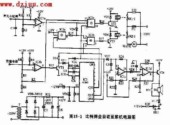 下面介紹全自動豆?jié){機電路,本電路基于4060集成電路,為廣大電子電器維修工作者提供維修數(shù)據(jù),我們會不斷提供更新的電路圖出來,也歡迎大家為容源電子網(wǎng)提供電路圖,本文由m.jssjbk.com整理提供,部分內(nèi)容來源于網(wǎng)絡(luò),如有侵犯到你的權(quán)利請與我們聯(lián)系更正。