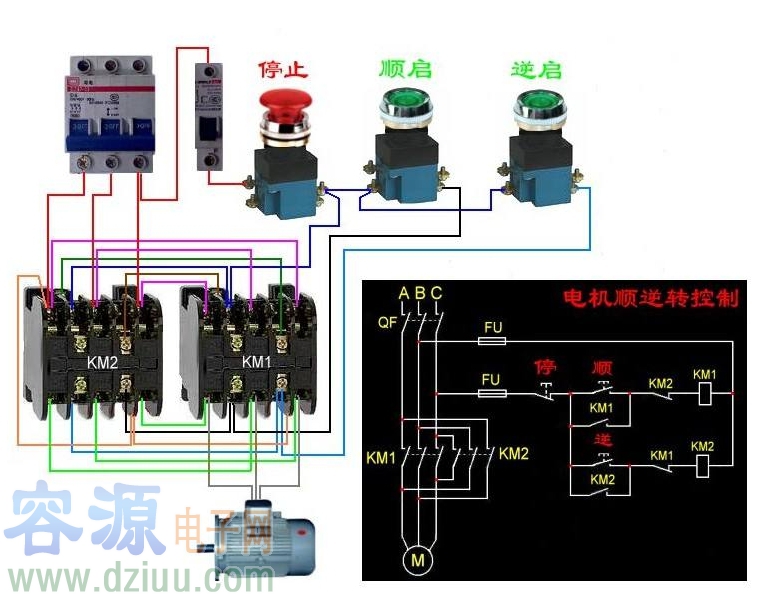 有些朋友可能會問,從實物接線圖中,怎么知道按鈕開關哪個是動合開關,哪個是動斷開關呢。這個很簡單,你只要觀察按鈕接線柱的高低就能分析出來。從上圖中,觀察停止按鈕,兩個接線柱高的就是動斷開關接線柱,正轉和反轉都是接在下面兩個接線柱上的。交流接觸器上的動斷和動合區分方法也很簡單,還是看上下觸點,最上面的接線柱就是動斷開關,最下面的接線柱就是動合開關。