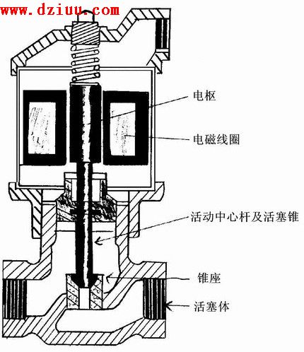 圖中畫的是電磁閥的截面圖,即所謂電磁閥。電磁線圈中