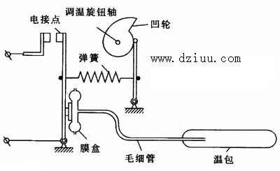 程度時,觸點閉合,冰箱壓縮機開始工作,進行制冷。當溫度降低時,飽和氣體收縮,壓力降低,觸點斷開,停止制冷。如此循環,把冰箱溫度恒定在