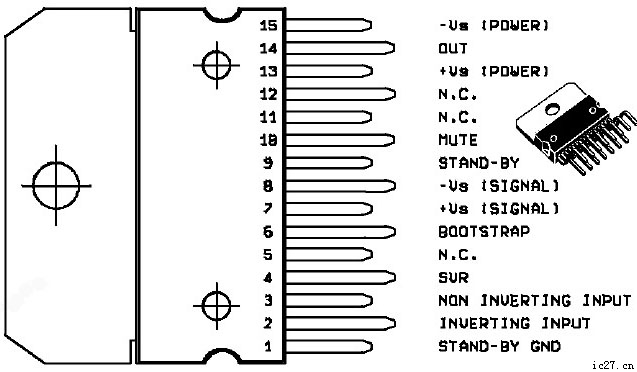 TDA7294廣泛用于Hi-Fi領(lǐng)域,如家庭影院、有源音箱。該器件為15腳封裝,外形如圖