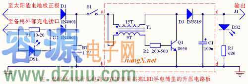 太陽能供電板的電路如圖1所示。由D1、BT構(gòu)成系統(tǒng)的太陽能充電電路。平時(shí),只要達(dá)到一定光強(qiáng),太陽能電池板便通過二極管D1為充電電池BT充電,直至飽和。除了太陽能充電方式外,我還設(shè)計(jì)了備用的外部直流電源充電接口以防不時(shí)之需。外部充電電路由R1、DS1、D2、BT構(gòu)成,R1選用功率為1W的電阻,當(dāng)R1為10歐姆的時(shí)候,最佳外部充電電壓為3-4伏,DS1為外部充電指示燈,它是利用電阻R1上的壓降來點(diǎn)亮的。后面的升壓電路是運(yùn)用間歇振蕩器的快速關(guān)斷(截止)的特性而實(shí)現(xiàn)升壓的。S1為供電開關(guān),當(dāng)S1閉合后升壓電路開始工作,太陽能供電板便可驅(qū)動(dòng)負(fù)載,J1為輸出接口,DS2是輸出指示燈。