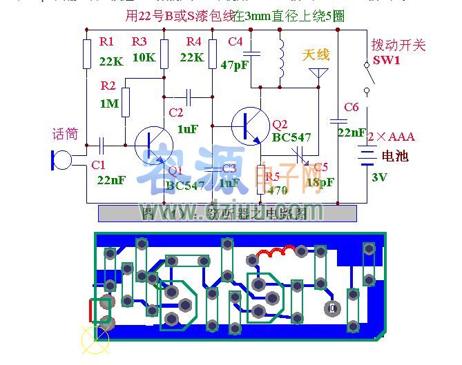 的范圍。 電路工作原理 從圖(1)電路可見分兩級(jí),一級(jí)音頻放大器和一級(jí)RF振蕩器。 駐極體話筒內(nèi)