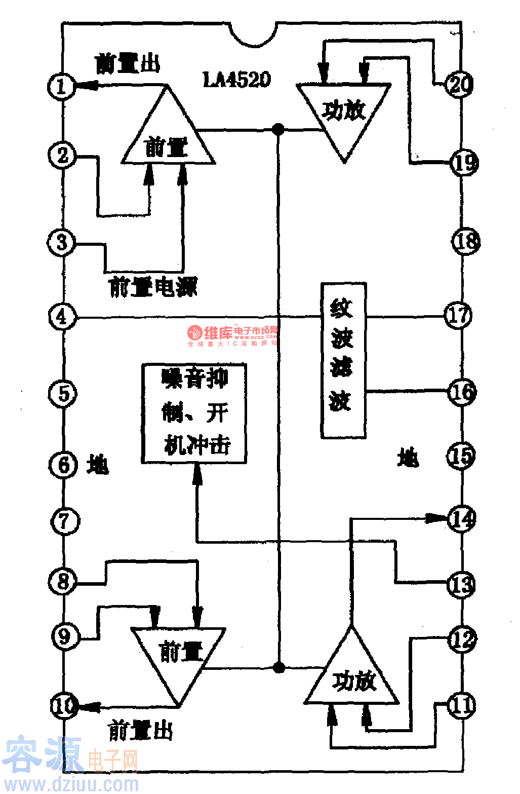 LA4570是日本三洋公司推出的放音機(jī)專用集成電路。國產(chǎn)、國內(nèi)組裝或進(jìn)口的單放機(jī)及收放機(jī)中,都應(yīng)用LA4570的機(jī)型! 1·以4570內(nèi)電路方框圖及引腳功能 LA4570集成塊是雙前置放大雙功放器件,具有電源電壓