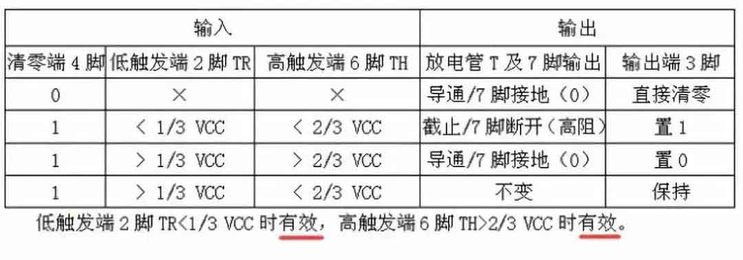綜上所述,在8腳接電源VCC,1腳接地,5腳未外接電壓的條件下,555時(shí)基電路的邏輯功能表如下: