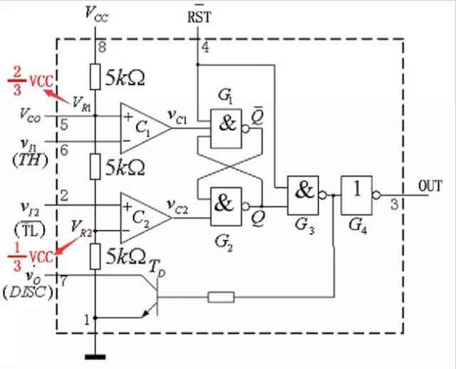 它內(nèi)部包括兩個(gè)電壓比較器,三個(gè)5K等值串聯(lián)電阻,一個(gè) RS 觸發(fā)器(由G1和G2構(gòu)成),一個(gè)放電三極管T 及功率輸出級(jí)。它提供兩個(gè)基準(zhǔn)電壓VR2(1/3 VCC) 和VR1(2/3 VCC),如下圖所示。