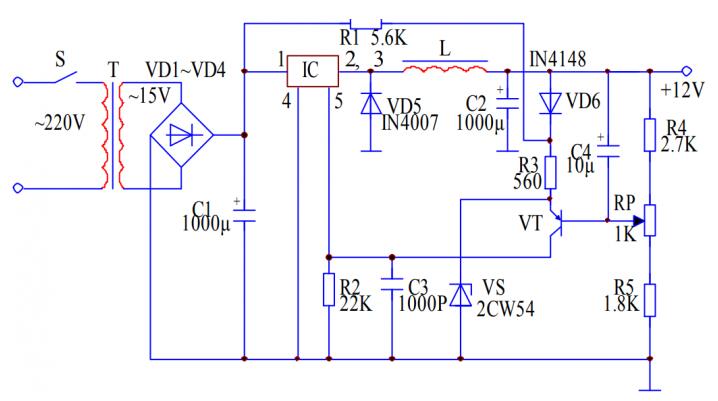 當(dāng)輸出電壓達(dá)到 6V 時,穩(wěn)壓管 VS 擊穿,電阻器 R3 上的電流增加,導(dǎo)致 R3 上的電壓增加,當(dāng)輸出電壓達(dá)到 12V 時,三極管 VT 從飽和狀態(tài)變?yōu)榉糯鬆顟B(tài)。當(dāng)輸出電壓超過 12V時,三極管 VT 的發(fā)射結(jié)電壓降低,使得集電極輸出電壓下降,當(dāng)下降到 1.6V(即 IC 集成電路的 5 腳電位下降到 1.6V)時,IC 開關(guān)集成電路斷開,電感器 L 的電流下降,輸出電壓也隨著下降,當(dāng)下降到 12V 時,三極管 VT 的集電極電位上升為 1.6V 以上,IC 集成電路再次導(dǎo)通,使得輸出電壓始終穩(wěn)定在 12V。