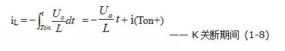 式中–Uo前的負號,表示K關斷期間電感產生電動勢的方向與K接通期間電感產生電動勢的方向正好相反。對(1-7)式進行積分得: