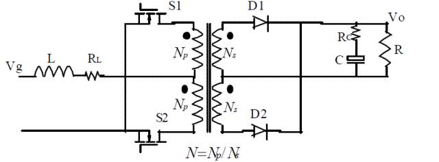 (1):對稱驅動推挽Boost 變換器的電路圖:
