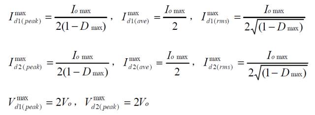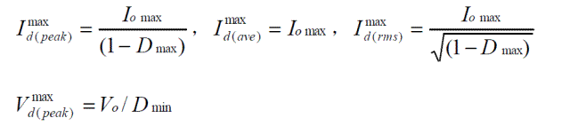 上述公式是穩(wěn)態(tài)工作時(shí),功率器件上的電壓、電流應(yīng)力。選擇功率器件時(shí),其電壓耐量可放一個(gè)合適的余量(保證最壞情況下的電壓峰值不超過(guò)此值),電流耐量則得按器件的結(jié)溫降額要求決定、它與外部散熱條件和器件的通態(tài)電阻、通態(tài)壓降、結(jié)電容、反向恢復(fù)、結(jié)到殼的熱阻等密切相關(guān),是功率器件熱設(shè)計(jì)的內(nèi)容