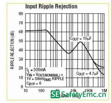 對比曲線上圖的曲線和左圖的波形,可以看出對幾百KHz的開關紋波,LDO的抑制效果非常好。但在高頻范圍內(nèi),該LDO的效果就不那么理想了。