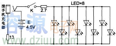 當電池電壓為4.38V時工作電流實測約150mA,LED上的壓降為3.2V.為有效延長電池的使用時間,筆者決定在按鈕開關K后面串接小阻值的限流電阻,經反復試驗采用2.7Ω電阻時電流降為120mA,亮度亦無明顯變化。如嫌電池昂貴也可改用220V交流市電,這就需要配一個合適的電源適配器,建議選用家中已廢棄的手機電池充電器,由于手機充電器插頭外形繁多不一,需提前用單聲道耳機插頭改造一下,筆者找到的充電器輸出電壓6.28V,改造后電路原理圖如圖2所示,實測工作電流約138mA。