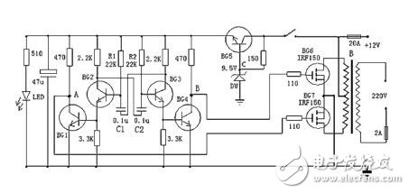 下圖較為容易制造的逆變器電路圖,能夠將12V直流電源電壓逆變為220V市電電壓,電路由BG2和BG3組成的多諧振蕩器推進,再經過BG1和BG4驅動,來控制BG6和BG7工作。其中振蕩電路由BG5與DW組的穩壓電源供電,這樣能夠使輸出頻率比擬穩定。在制造時,變壓器可選有常用雙12V輸出的市電變壓器。可依據需求,選擇恰當的12V蓄電池容量。
