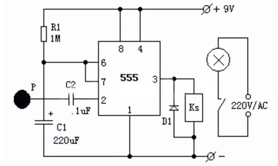 集成電路IC1是一片555定時電路,在這里接成單穩態電路。平時由于觸摸片P端無感應電壓,電容C1通過555第7腳放電完畢,第3腳輸出為低電平,繼電器KS釋放,電燈不亮。