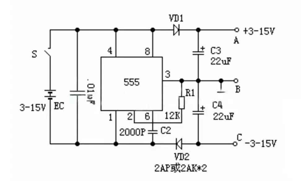 附圖電路中,時基電路555接成無穩態電路,3腳輸出頻率為20KHz、占空比為1:1的方波。3腳為高電平時,C4被充電;低電平時,C3被充電。由于VD1、VD2的存在,C3、C4在電路中只充電不放電,充電最大值為EC,將B端接地,在A、C兩端就得到+/-EC的雙電源。本電路輸出電流超過50mA。