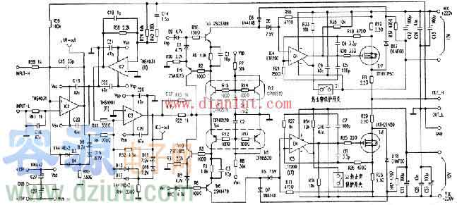 本文介紹一個由運放和多個晶體管組成的10W功率放大器電路,如下圖所示,元件雖然多了一點,但是失真度卻非常低。10W低失真運放推動晶體管功放制作電路 電路中運放的作用是電壓放大,晶體管VT1~VT7用于電流放
